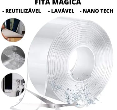 FITA NANO MAGICA LAVÁVEL FACE DUPLA REUTILIZAVEL - A novidade é que essa fita adesiva é lavável e tem um grande tempo de uso. - Feito de um gel extremamente poderoso, é a solução que você estava procurando. A fita adesiva dupla face foi feita para ser uma ferramenta confiável, muito útil e forte para grudar itens um ao outro.